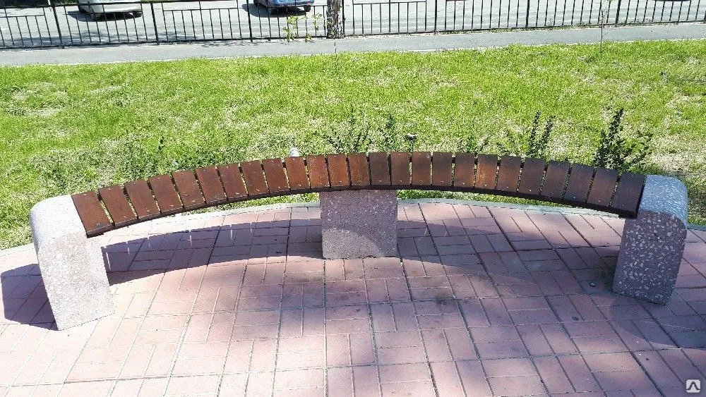 Внешний фасад конструкции лавки имеет разные возможные фактуры: габбро-диабаз, красный гранит, московский гравий, мрамор "Шахматка", питерский гравий, серо-красный гранит, чистый бетон. Благодаря новым современным европейским технологиям в опорах отсутствует несущая металлическая конструкция, а значит опора не будет подвержена ржавчине. Сиденье скамейки состоит из деревянные рейки с сечением 40х80 мм, покрытых защитным составом с UF фильтром. Сиденье скамейки возможно как прямое так и изогнутое, относительно своей оси, деревянные рейки сиденья расположены перпендикулярно основанию скамейки.